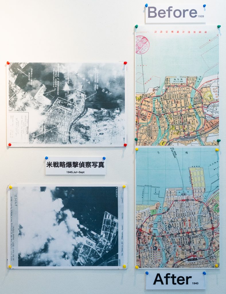 でも、地図の隣に掲示されているアメリカ軍が空撮した写真には、中央埠頭がバッチリ写っている。こうなると、地図から消しても、埠頭の存在は隠しきれませんね。