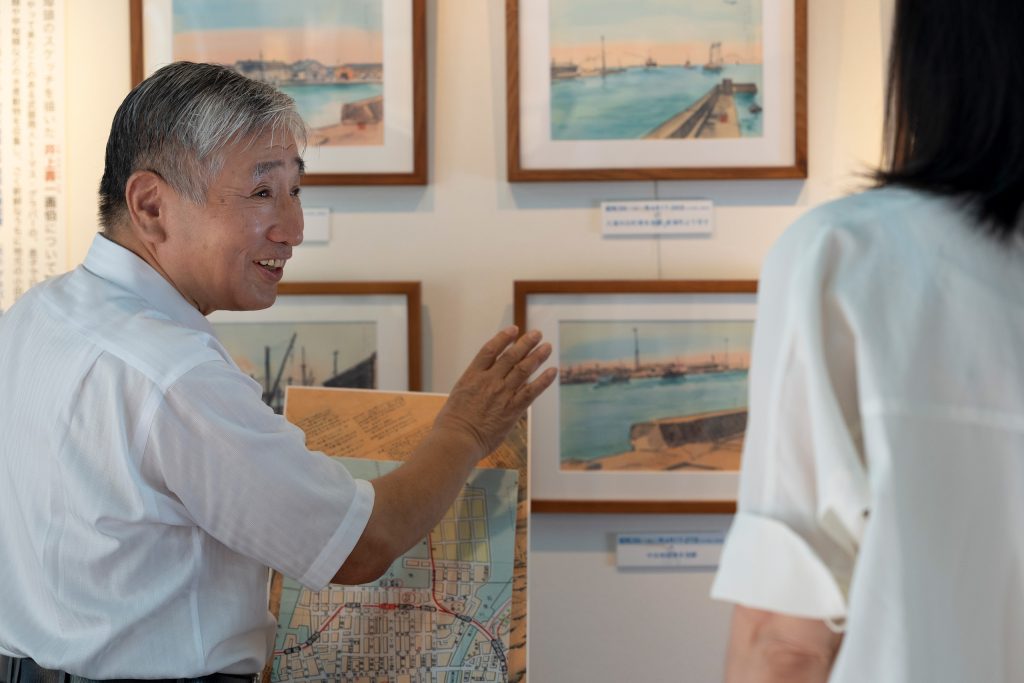 昭和36(1961)年の絵もあります。当時は作業員ですごく賑わっていました。倉庫とクレーンが描かれた絵を見ると思い出すことがあります。小学1年生のころ、井上先生の弟子の若い女の先生に連れられてこの場所に写生に出かけたんですが、その先生が私のことを忘れてしまって置いてけぼりにされたんです。一人ぼっちで、いつの間にか暗くなってきて、ベソをかいたことを覚えています。