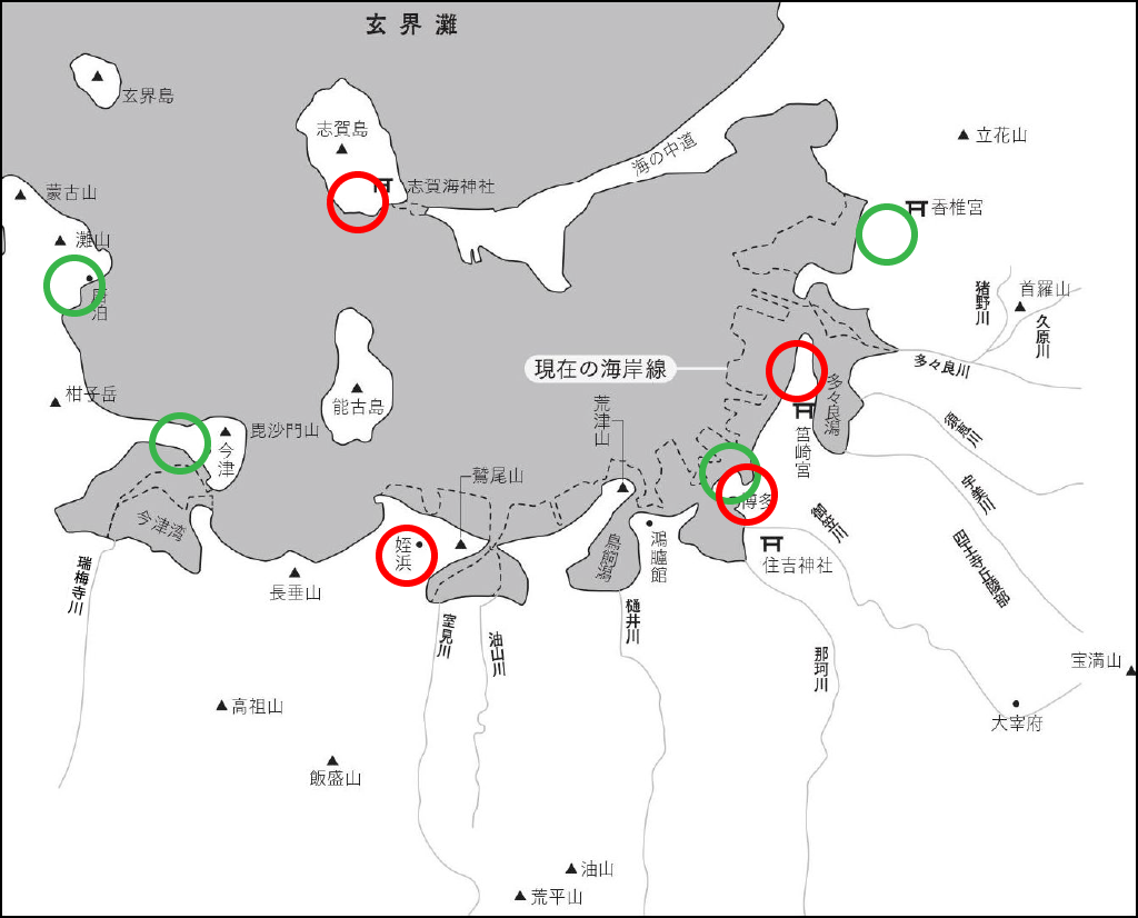 大友、大内でうまく港を分け合っていました。地図上で赤の輪がついている箱崎や姪浜は大内の港で、緑の輪が付いている香椎や今津は大友です。